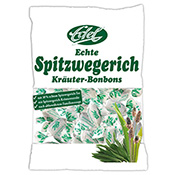 unterwegs - in diesen Bonbons werden über 10 % Spiztwegerich-Tee sowie Spitzwegerich-Extrakt und Enzian verarbeitet.