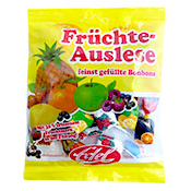 Fruchtsorten in einem attraktiven Beutel, mit den Sorten Erdbeer, Limone-Zitrone, Blutorange, Apfel, Himbeere, Schwarze Johannisbeere, Ananas und Multi-Frucht.