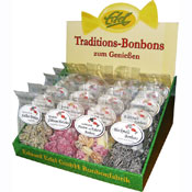 Die vier beliebtesten, edlen Seidenglanz-Bonbons in einem Sortiment, geliefert im bunt bedrucktem Verkaufsaufsteller