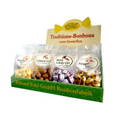 „Traditions-Bonbons zum Genießen". Mit Wiener Krachmandeln, Schoko Fourrée, Nougat-Stäbchen und Pfefferminzkissen.